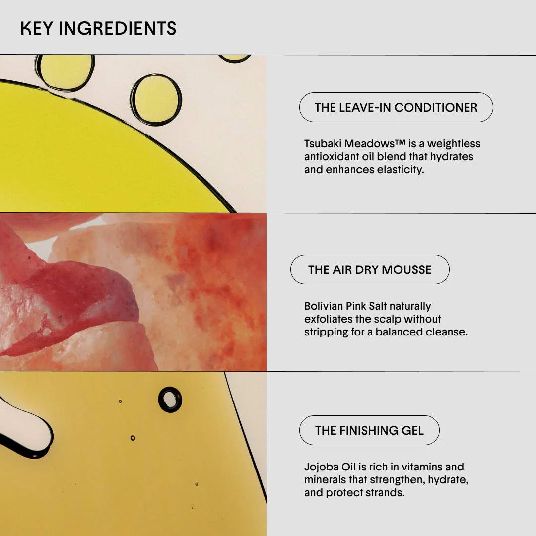 Qué más necesita saber: Aquí está todo lo que necesita para su secado al aire perfecto y sin esfuerzo. El acondicionador sin enjuague hidrata sin peso, mientras que The Texturizing Air Dry Mousse crea ondas y textura, y The Finishing Gel bloquea los estilos y suaviza el encrespamiento. El cabello queda suave y al tacto a medida que se seca, con una mezcla de antioxidantes y nutrientes para fortalecer y proteger la salud general del cabello.