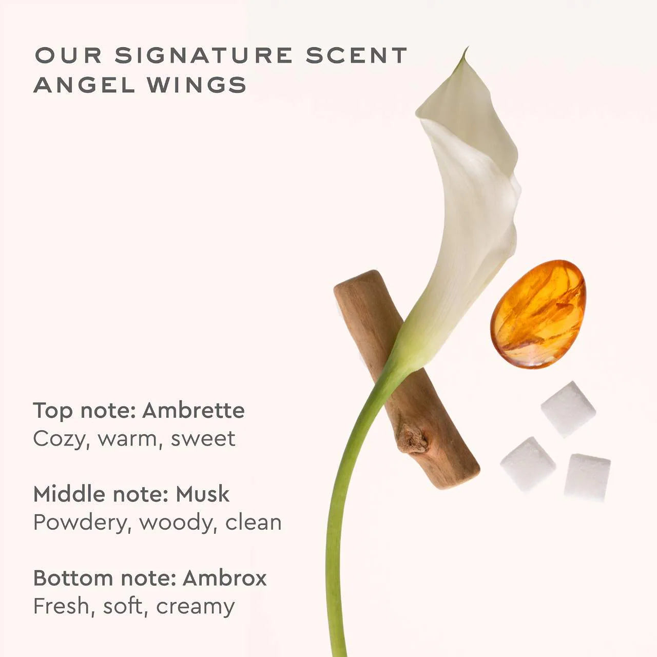 Descripción de la fragancia: Ligeramente perfumada en el aroma característico "Angel Wings" de Emi Jay. La fragancia fresca y limpia con notas de ámbar y almizcle ligero crea un aroma sutil que realza su aroma natural.