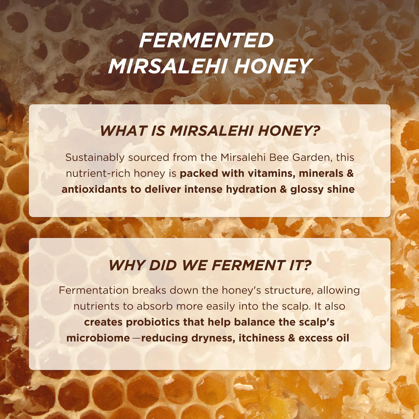 - Miel Mirsalehi fermentada: Promueve un cuero cabelludo sano y equilibrado.