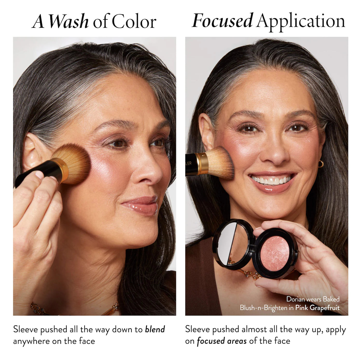 Qué es: Un pincel en ángulo retráctil diseñado para una aplicación suave y precisa de colorete, bronceador, contorno o polvo sobre la marcha.